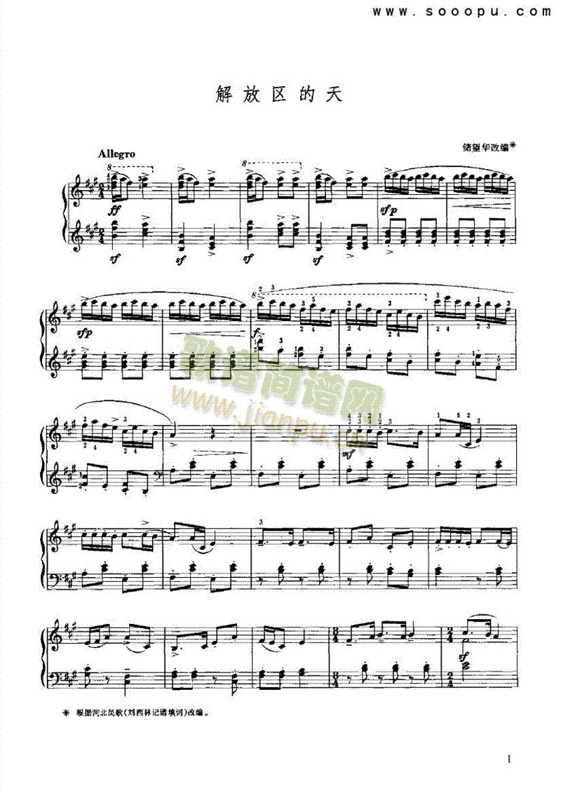 解放区的天 键盘类 钢琴免费钢琴谱_五线谱:储望华 点击: 1000 图片可能经过缩放,手机长按或点开后长按保存,电脑鼠标右键保存.
