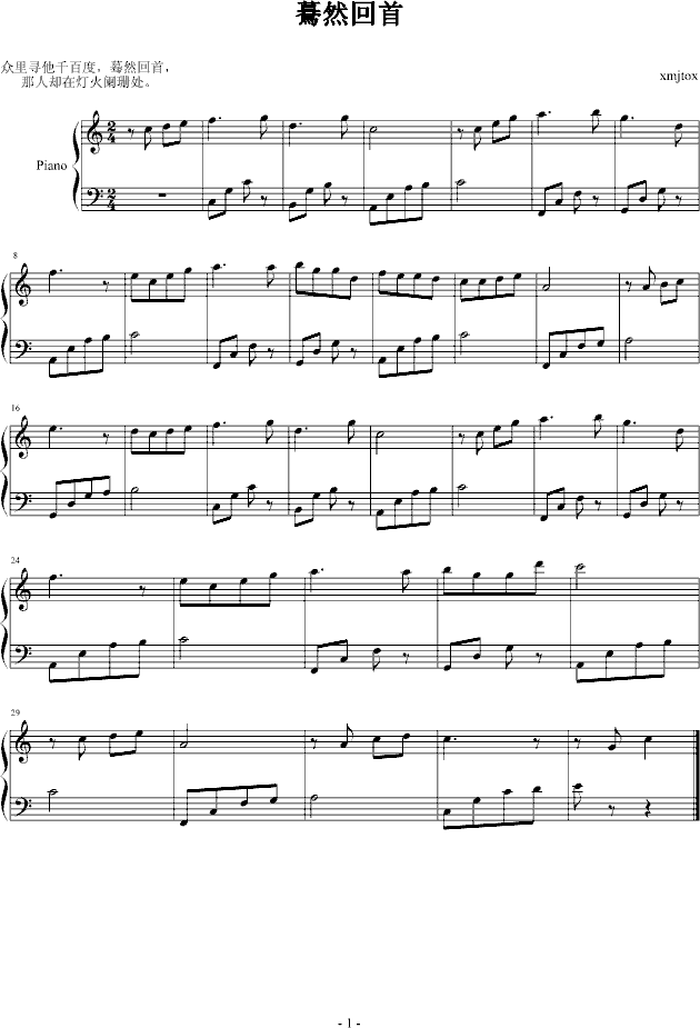 驀然回首免费钢琴谱_五线谱/词曲:xmjtoxxmjtox点击: 1000 图片可能经过缩放,手机长按或点开后长按保存,电脑鼠标右键保存.