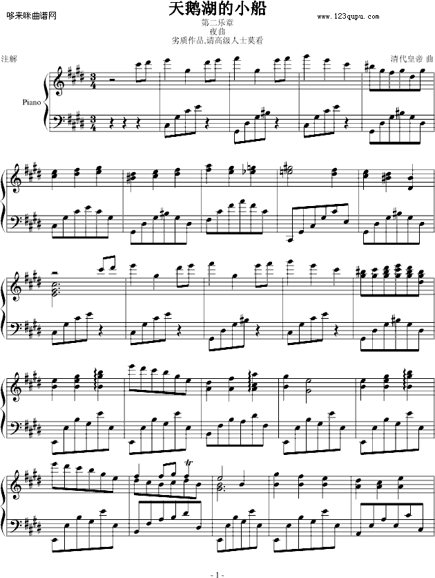 天鹅湖的小船第二乐章(夜曲)-清代皇帝免费钢琴谱_五线谱:未知 点击: 1000 图片可能经过缩放,手机长按或点开后长按保存,电脑鼠标右键保存.