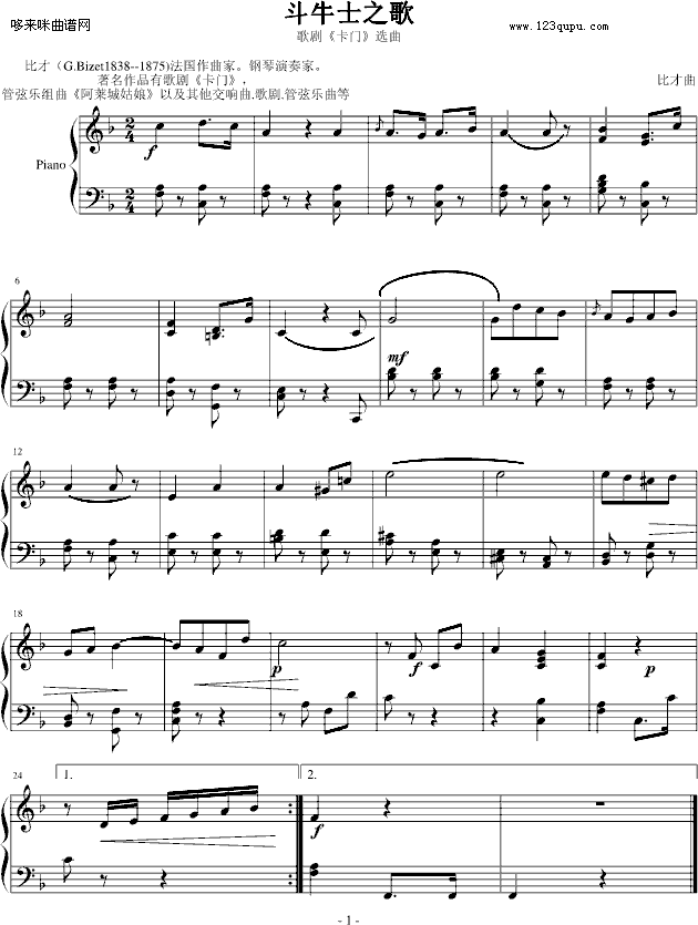 斗牛士之歌-比才免费钢琴谱_五线谱:未知 点击: 1000 图片可能经过缩放,手机长按或点开后长按保存,电脑鼠标右键保存.