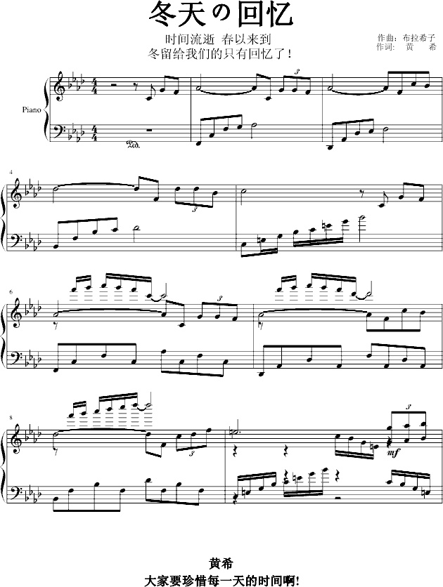冬的回忆免费钢琴谱_五线谱:布拉希子 点击: 1000 图片可能经过缩放,手机长按或点开后长按保存,电脑鼠标右键保存.