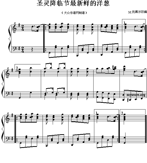 外国民歌改编钢琴曲:圣灵降临节最新鲜的洋葱免费钢琴谱_五线谱: 点击: 1000 图片可能经过缩放,手机长按或点开后长按保存,电脑鼠标右键保存.