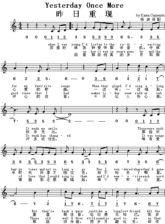 Yesterday Once More 昨日重现(中英文)免费钢琴谱_五线谱: 点击: 1000 图片可能经过缩放,手机长按或点开后长按保存,电脑鼠标右键保存.