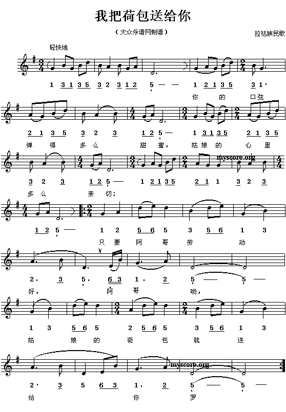 拉祜族民歌:我把荷包送给你(简线对照)免费钢琴谱_五线谱:未知 点击: 1000 图片可能经过缩放,手机长按或点开后长按保存,电脑鼠标右键保存.