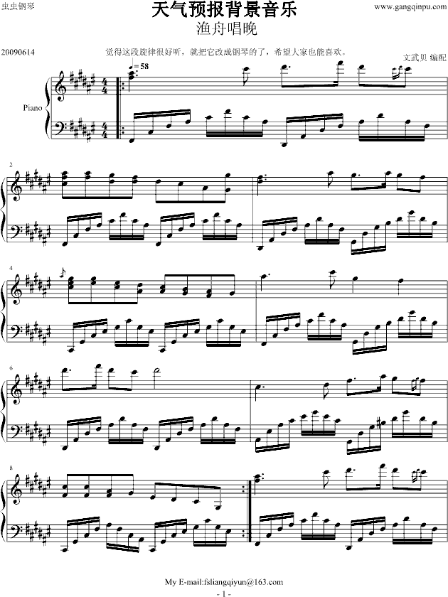 天气预报背景音乐--渔舟唱晚-钢琴谱(钢琴曲)-中国名曲免费钢琴谱_五线谱: 点击: 1000 图片可能经过缩放,手机长按或点开后长按保存,电脑鼠标右键保存.