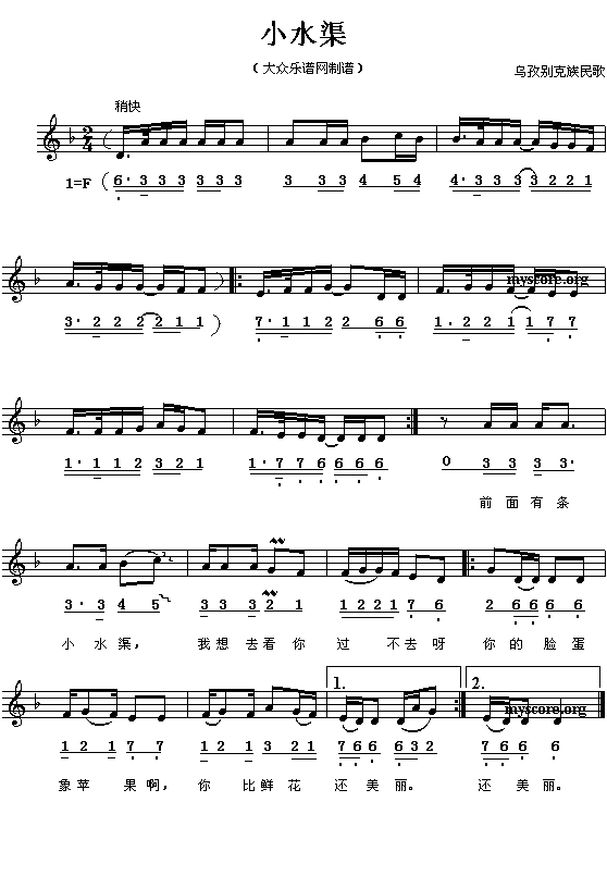 乌孜别克族民歌:小水渠(简线对照)免费钢琴谱_五线谱:未知 点击: 1000 图片可能经过缩放,手机长按或点开后长按保存,电脑鼠标右键保存.