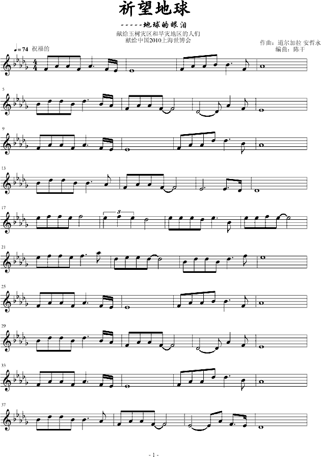 祈望地球-钢琴谱(钢琴曲)-陈干免费钢琴谱_五线谱: 点击: 1000 图片可能经过缩放,手机长按或点开后长按保存,电脑鼠标右键保存.