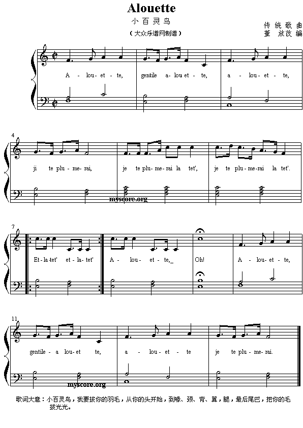 英文儿歌钢琴小弹唱:Alouette(小百灵鸟)免费钢琴谱_五线谱: 点击: 1000 图片可能经过缩放,手机长按或点开后长按保存,电脑鼠标右键保存.