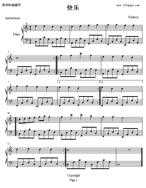 快乐-kiraboy免费钢琴谱_五线谱:未知 点击: 1000 图片可能经过缩放,手机长按或点开后长按保存,电脑鼠标右键保存.