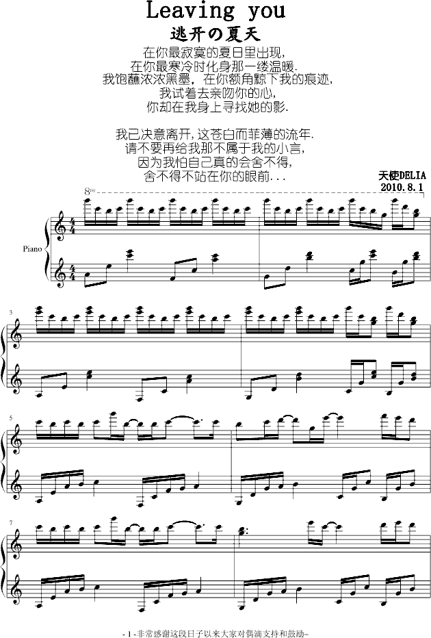 逃开の夏天 Leaving you-钢琴谱(钢琴曲)-天使DELIA免费钢琴谱_五线谱: 点击: 1000 图片可能经过缩放,手机长按或点开后长按保存,电脑鼠标右键保存.